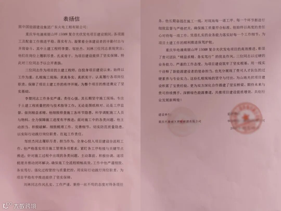 ●3月31日,重庆华电潼南丽山坪150兆瓦复合光伏发电项目收到重庆市潼南区华电新能能源有限公司发来的表扬信。
