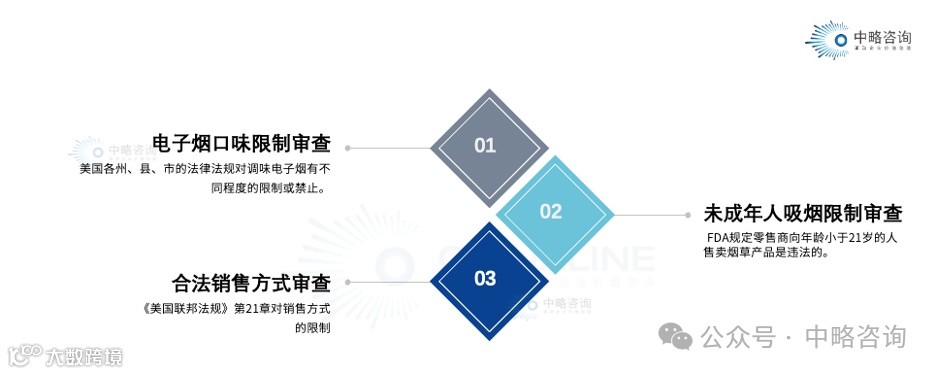 未成年人吸烟限制审查:FDA规定零售商向年龄小于21岁的人售卖烟草产品是违法的。根据《限制售卖和分销香烟和无烟烟草的规定》和《认定烟草产品受联邦食品药品和化妆品法的限制》,零售商必须通过带有照片的身份证明来核实购买者达到法定年龄。
