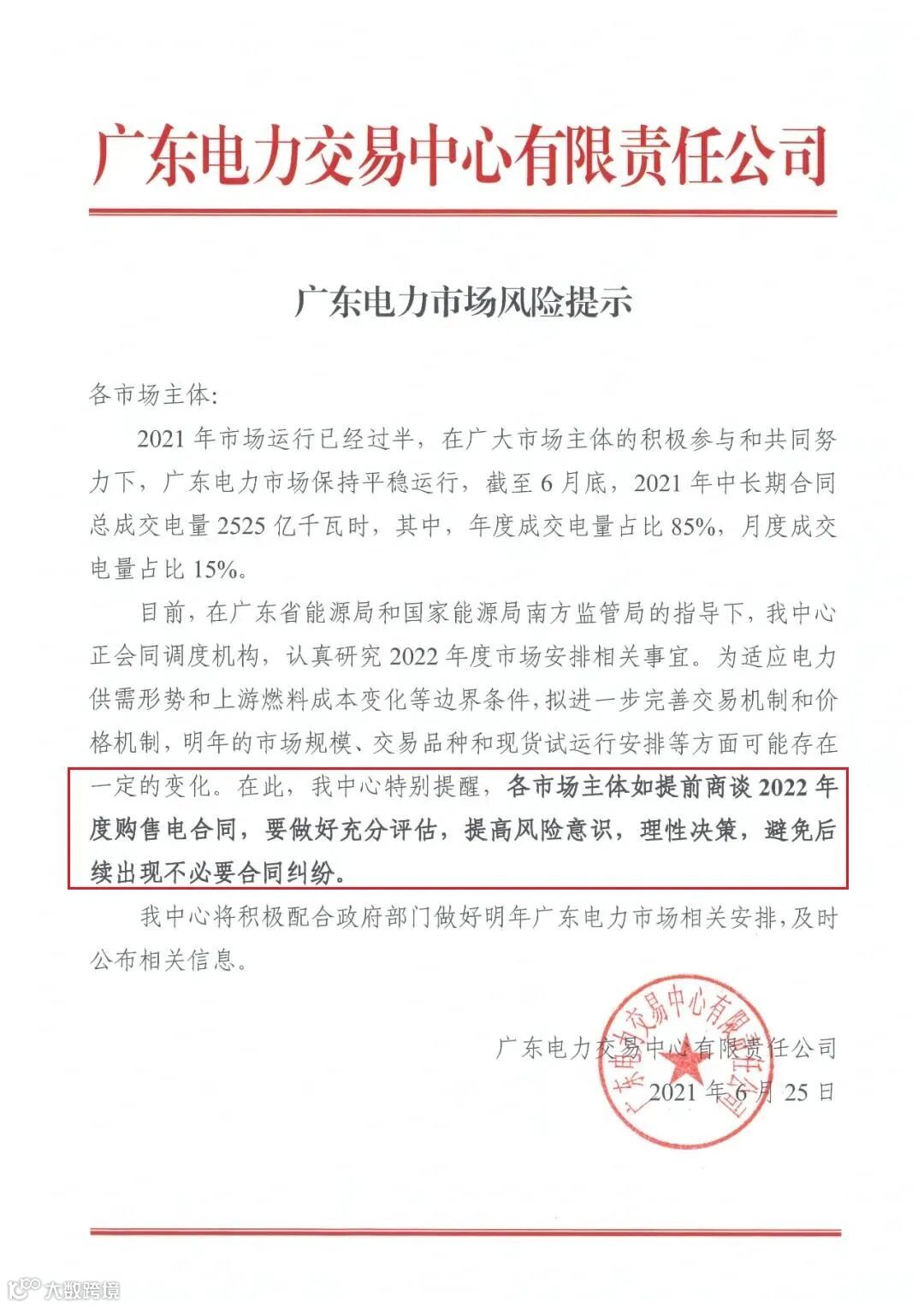 6月25日,广东电力交易中心向市场主体郑重发布了风险提示,文中提到交易中心正在会同调度机构认真研究2022年度市场安排相关事宜。预计明年的市场规模、交易品种和现货试运行安排等方面可能存在一定的变化。广东电力交易中心特别提醒:各市场主体如提前商谈2022年度购售电合同,要做好充分评估,提高风险意识,理性决策,避免后续出现不必要合同纠纷。