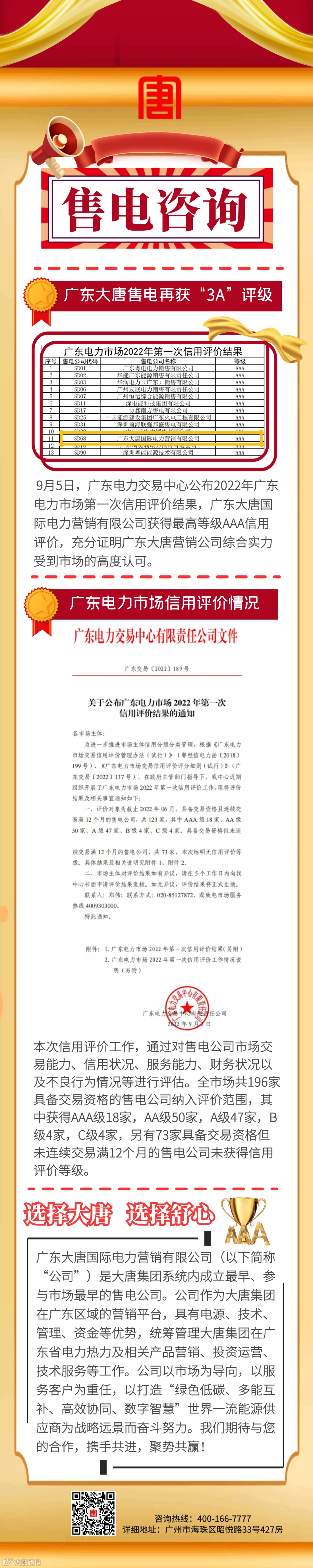 广东大唐营销公司再获信用评价“3A”最高等级
