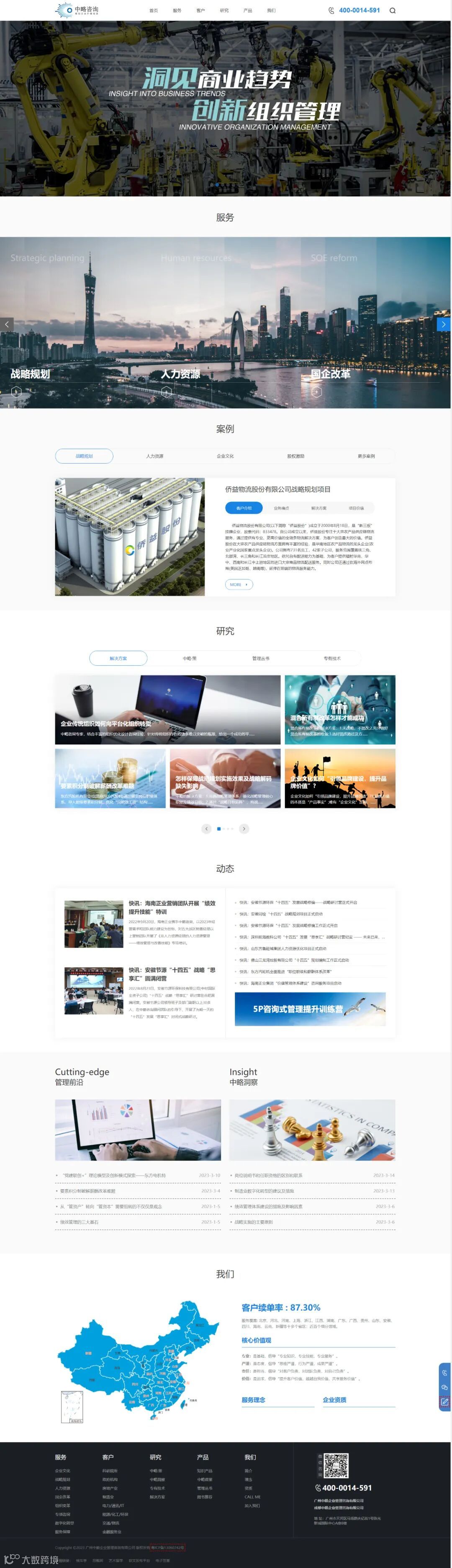 设有“首页、服务、客户、研究、产品、我们”六大栏目及下拉菜单,网站信息层级清晰直观,帮助用户快速到达感兴趣的页面。全方位、多层次立体展示中略咨询不仅具有深厚的理论素养,且具有丰富的企业管理经验。