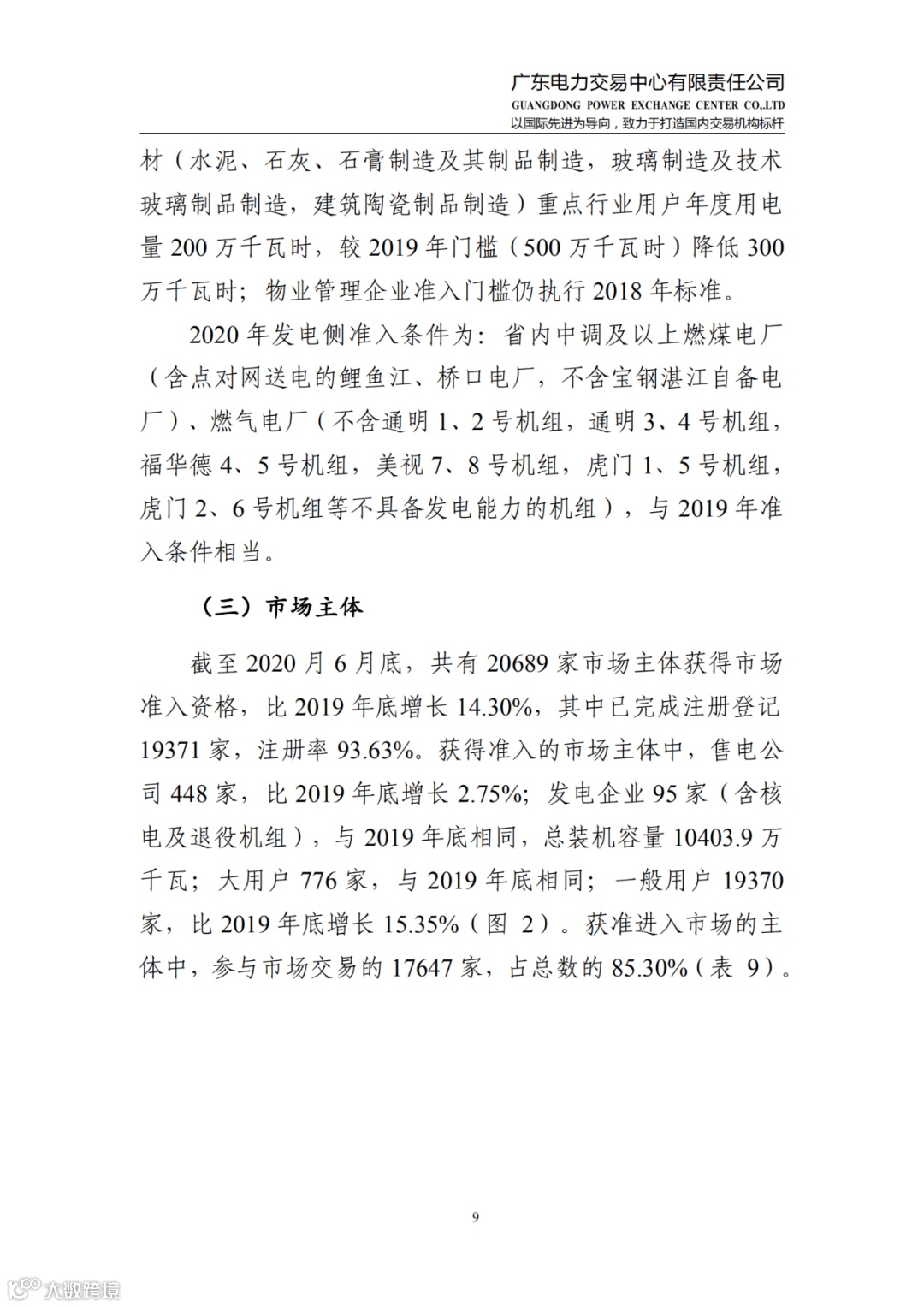 截至2020月6月底,共有20689家市场主体获得市场准入资格,比2019年底增长14.30%,其中已完成注册登记19371家,注册率93.63%。获得准入的市场主体中,售电公司448家,比2019年底增长2.75%;发电企业95家(含核电及退役机组),与2019年底相同,总装机容量10403.9万千瓦;大用户776家,与2019年底相同;一般用户19370家,比2019年底增长15.35%。