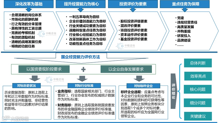 中略咨询根据多年服务央国企改革的经验,结合大量的项目实践,将建设新型经营责任制体系的策略总结为:以深化改革为基础、以提升经营能力为核心、以投资评价为要素、以重点任务为保障,从而建设一套符合国有企业真正的经营能力评价的经营责任制。
