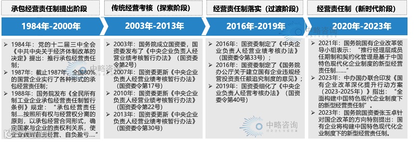 我国央国企经营责任考核的改革最早始于1984年,直到2023年“新型经营责任制”的正式提出,正好过去了40年,期间历经承包经营责任制、经理人契约化、新型经营责任制等阶段。