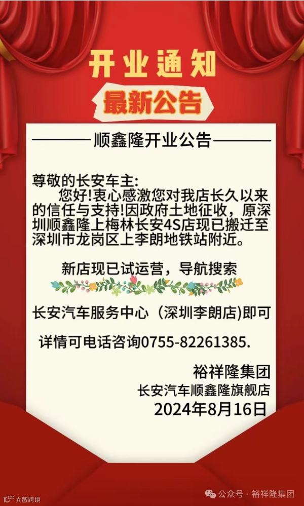 尊敬的长安车主:您好!衷心感激您对我店长久以来的信任与支持!因政府土地征收,原深圳顺鑫隆梅林长安4S店现已搬迁至深圳市龙岗区上李朗地铁站附近。新店现已试运营,导航搜索长安汽车服务中心(深圳李朗店)即可。24小时服务热线:0755-82261385.(营业时间8:30-18:00)
