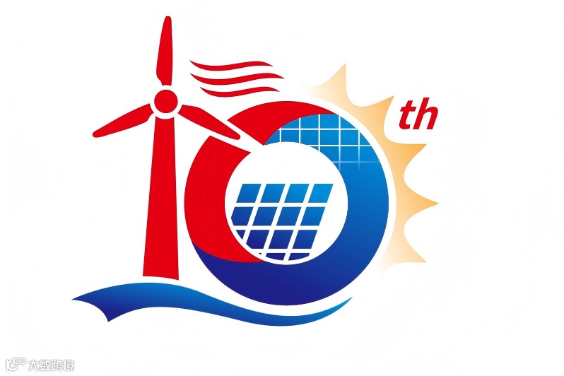 数字与产业符号融合:将“10”的造型与新能源核心设施结合,“1”以红色风力发电机呈现,直观体现风电产业;“0”则融入蓝色太阳能板,突出光伏产业,二者共同彰显新能源领域风电、光伏的核心地位。
