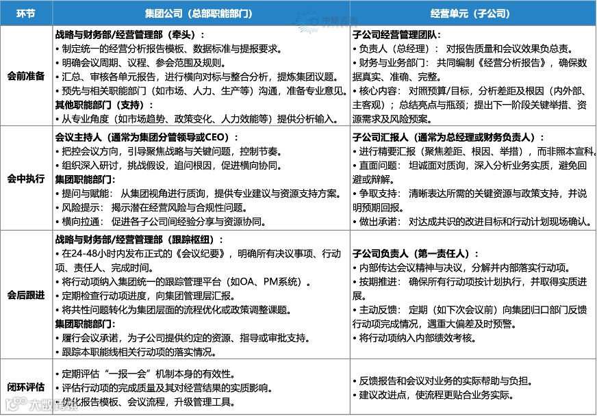 在“一报一会”管理闭环中,集团公司与经营单元承担着明确互补的责任。集团公司是管理中枢,负责制定分析标准、审核经营数据、识别系统性风险,并通过会议提出质询、协调资源与督促落实。其核心角色是把握方向、设定规则并提供支持。经营单元(子公司) 是执行主体,负责如实反映经营状况,深入分析业绩波动的具体原因,提出可行性改进方案,并在获得授权后全力达成目标。其根本任务是创造利润、解决问题并对结果负责。
