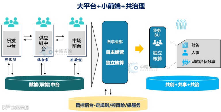 内部平台型组织(后台-中台-前台):内部平台主要是管理赋能平台,通过功能性平台的打造,赋能市场前端,内部平台以后台-中台-前端的运行方式,后台主要为职能管理平台,负责整合资源,打造开放管理体系,构建内部生态,中台主要为业务赋能平台,负责匹配、赋能,分析市场前端的需求和特征,快速有效满足业务、资源、技术、数据等方面的需求,前端则围绕客户,挖掘并及时响应客户需求,实现商业成功。