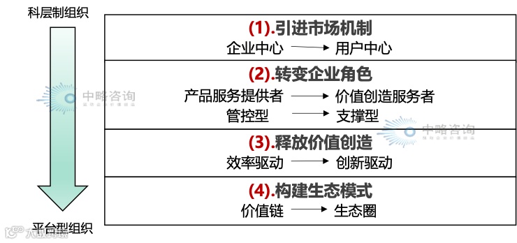 一般将科层制组织(直线职能制)打造成平台型组织,需要:(1)引进市场化机制(转观念,从企业中心,转到用户中心);(2)转变企业角色(从管控型转向支撑型,从关注产品服务转向价值创造服务);(3)释放价值创造(创新内驱机制);(4)构建生态模式(沿价值链打造组织价值创造生态圈)。