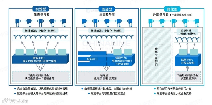 外部平台型组织(大平台+富生态):外部平台主要为经营和生态赋能平台,是企业利用已有资源优势,打开组织边界,通过搭建平台,赋能内外部经营前端,扩大网络效应,客户可以享受更多企业提供的产品/服务甚至技术,其他参与方企业也可以利用外部平台的资源和网络效应在平台上创业创新,形成大平台+富生态的价值体系。