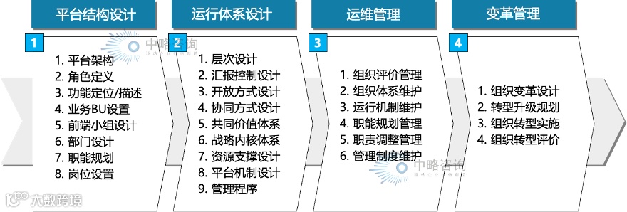 平台化组织的管理体系及流程的内容主要涵盖了“组织结构设计、组织运行设计、组织运行维护和组织变革(转型/升级)”四个核心部分,具体主要包括以下内容: