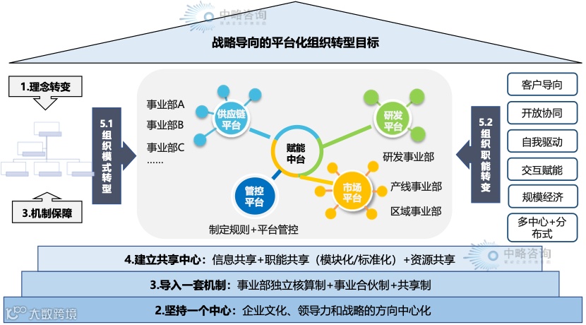 平台化组织体系建设应以“市场前台、研发中台、供应链中台、赋能中台(职能中台)、管控后台”的建设为目标为导向,以“战略为引领”,理念创新先行、文化创新先行,创新机制,夯实数字化、移动化、业务模块化标准化等组织共享服务能力建设为抓手,展开组织转型。
