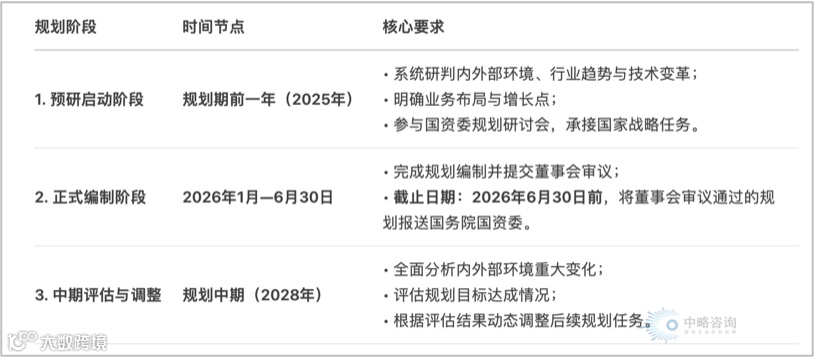 《中央企业发展规划管理办法》中,国家对中央企业“十五五”战略规划的时间节点提出了明确要求,体现出制度化、程序化和刚性约束的特点。可以把“十五五”规划编制分为三个阶段,分别是预研启动、正式编制和中期评估与调整。预研阶段在规划期前一年,即2025年,主要做环境分析和业务布局。正式编制阶段的时间节点很明确,要求在2026年6月30日前提交董事会审议通过的规划给国资委;中期评估在2028年,也就是规划中期,进行评估和调整。具体核心要求见下图: