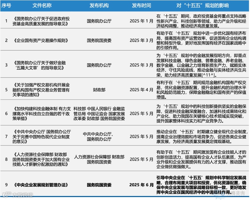 中略咨询作为长期服务国资央企战略规划编制的专业咨询机构,将结合在战略规划方面的专业和经验,通过系统梳理2025年上半年国资国企领域的重要政策,深入解读《中央企业发展规划管理办法》的核心要义,为国央企"十五五"规划的编制与实施提供实践指南。