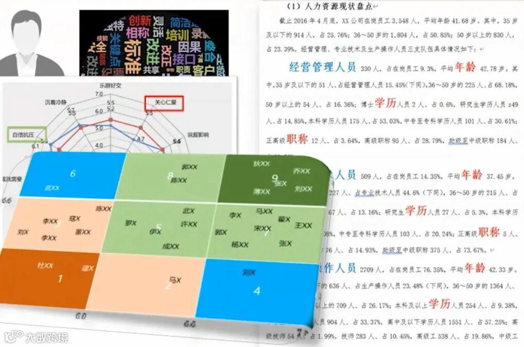 如图中右侧的word 文档显示,只是简单分出了经营管理人才、专业技术人才等不同条线,然后将其中的一些关键词突出显示。针对不同条线的所有分析内容全部是相同的结构,就是年龄、学历、职称等。
