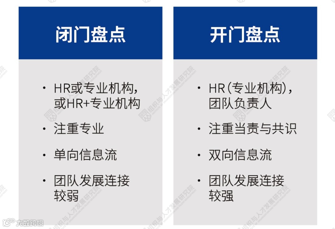 开门盘点实际上是两种角色,一种角色可以是人力资源部门或是专业机构,又或者是两者结合;另一种增加的角色是真正负责业务的团队负责人。