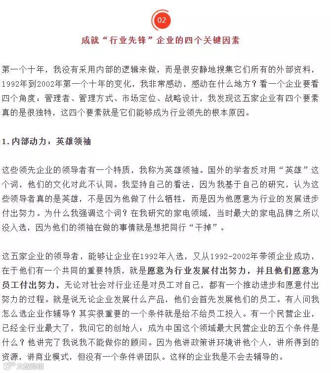 这五家企业内部的朝气一直在保持,它们不受外部环境的影响,更重要的是他们不断革自己的命,超前于外部环境来革自己的命,他们对外部所有的变化反应速度非常快。这就使得他们变得成功,我在《领先之道》这本书里详细阐述了这个研究结论。