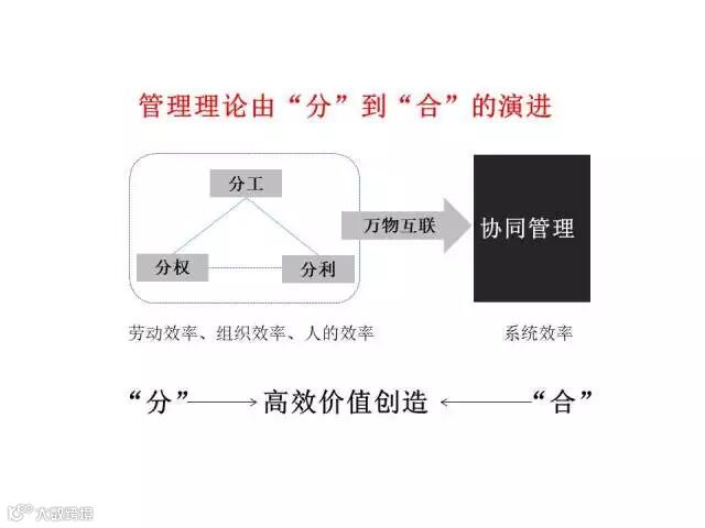 在管理理论由“分”到“合”的演进过程中,很重要的一个问题是,我们怎样才能得到更大的系统效应?以前讲分工是提升劳动效率,分权是提升组织效率,分利是提高人的效率,因此产生科学管理原理、行政组织理论、人力资源理论。今天我们需要的效率,不仅仅来源于劳动效率、组织效率和人的效率,还来源于更大的系统效率。
