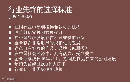 在研究了所有文献之后,我发现一个优秀的企业,应该在图中这8个方面做出努力并不断调整。其实在1992年,中国还找不到这样的优秀企业,但是这个研究是不能就此放弃的,我就把研究定位调整了一下。因为我发现了另外一种可以称之为行业先锋的企业,当时它可能不优秀,但是已经走到行业前端,是行业领先的企业。这一发现给了我研究的灵感,不知道1992年时张首席是否给海尔设计了30年发展规划,我自己当时做了一个持续30年的研究计划——筛选5家中国企业,跟踪研究30年,看它们每个10年里有什么样的实践,有什么样的发展。