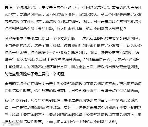所以,现在决策层对中国未来经济两个重大问题的判断,一个是风险在哪里,一个是增长在哪里。风险主要是金融风险,所以要防范金融风险;增长主要是供给侧方面,所以叫供给侧结构性改革。全文重点就是两句话,一句叫防范金融风险,一句叫推动供给侧结构性改革。而把这两句话统一起来,叫“稳中求进”。未来的整个增长方略,也即未来的主要指导对策,就是“稳中求进”。稳什么?不是稳增长,而是防范金融风险;进什么?推进供给侧结构性改革。我估计这句话可以管5年。谢谢大家!(根据魏杰教授演讲整理)