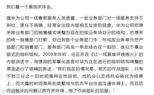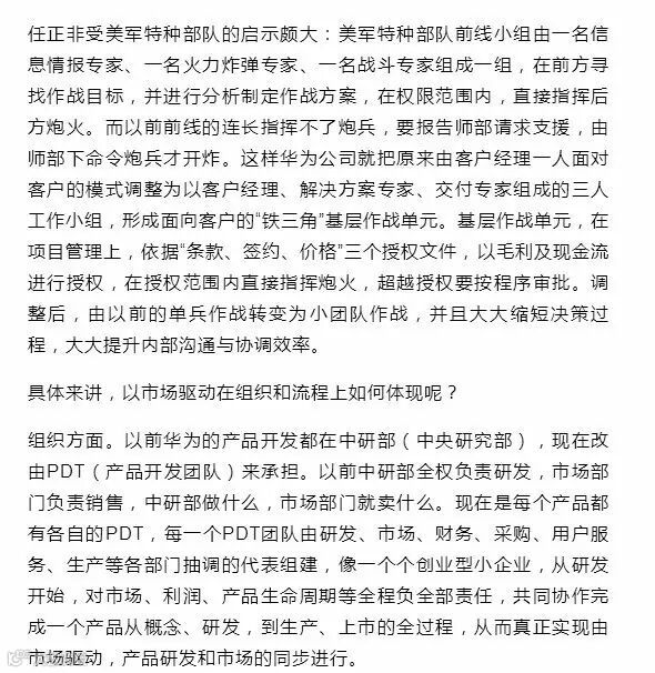 这里谈到的是分权情况下,如何实现市场驱动的流程协同。那么有一个问题:在集权的情况下能不能实现市场驱动流程呢?因为企业在起步时,一般是集权的,任正非在这次讲话中也说到:“我们并不否定廿年来公司取得的成绩。廿年来公司是实行高度的中央集权,防止了权力分散而造成失控,形成灾难,避免了因发展初期产生的问题而拖垮公司。”很显然,是否市场驱动,不是集权与分权的问题,分权可以市场驱动,集权也可以市场驱动,只要“掌权者”不是享受“审批”的快感,而是坚持一切为了前线的胜利,承担“市场责任”。就如任正非在华为高度集权的发展初期,对研发部门所言“华为没有院士,只有‘院土’,把‘士’的下面一横拉长一点。要想成为院士,就不要来华为。”这里的“院土”,就是任正非说的“工程商人”。企业是搞产品研发,不是搞发明创造,不是要破解歌德巴赫猜想,而是对产品的市场成功负责。只要确立“市场主义”,分权可以市场驱动,集权也可以市场驱动。