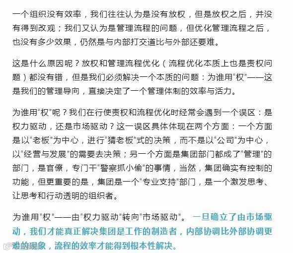 总而言之,我们的管理导向要明确“为谁用权”,这直接决定一个管理体制的效率与活力。分权集权都是控制,只要落实为分权可以市场驱动,集权也可以市场驱动。并且,我们需要始终记住,真理是:管理一定要为经营服务!