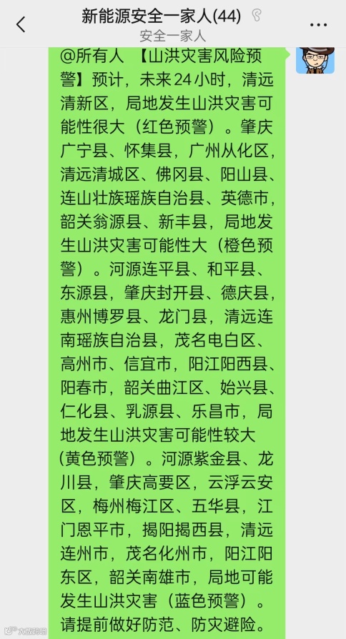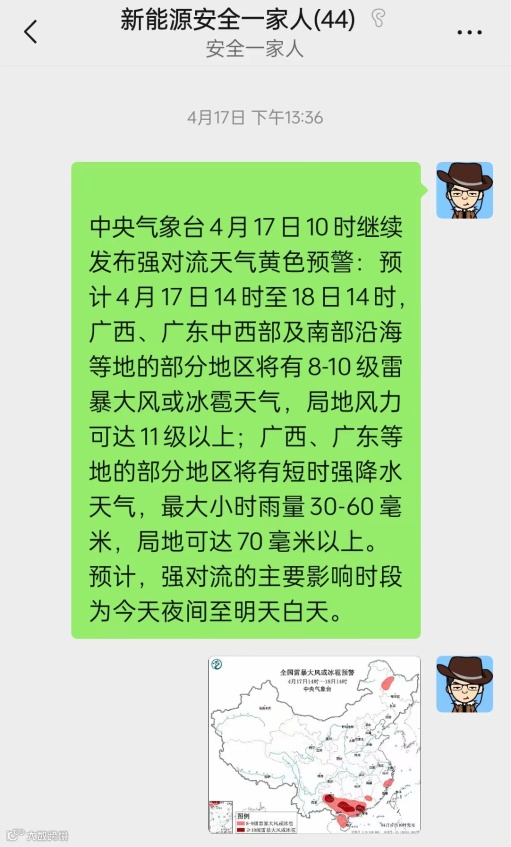 新能源公司QHSE部督促所属项目部(尤其位于南方强对流天气、雨水多发地区的项目部,其中广东地区共计14个项目)随时动态关注项目所在地区天气预警情况,同时做好汛前和汛时预警提醒和防灾工作。