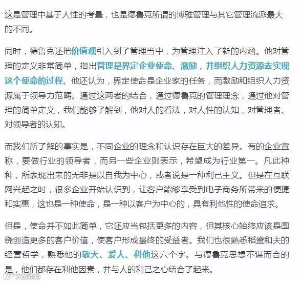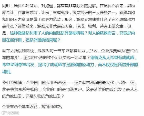 在人的需求当中,有一点是成就感,人需要活得更加有意义。因此,成就感就是激励的原动力。所以应该说,目标管理和自我控制理论,是德鲁克站在人性分析的基础上所得出的结论。包括联邦分权制。这不仅仅是一种组织形式,而是管理者要想办法将人之善发挥出来,同时抑制人性的阴暗面,抑制人对权力渴望的一种方式。
