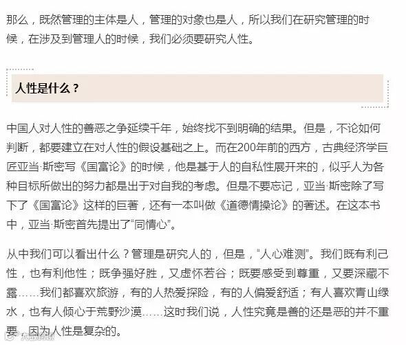 他始终围绕着人来展开,而不是告诉你,怎样用金钱实现激励。要想把这一切提升到新的高度,就要想办法把人的积极面发挥出来,实现他的目标管理和自我管理。这就是基于对人性的最基本分析。