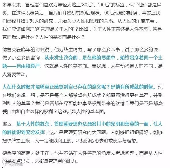 管理是靠“人”去做的,管理的对象也是“人”,所以德鲁克将“管理是关于人”的理念特意放到了管理原则第一条的位置。