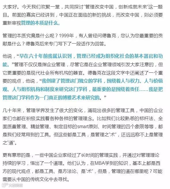 今天的主题是创新改变中国。而德鲁克的创新理论也处处体现了人性。比如针对创新的七个来源,他专门分析了人口结构变化带来的影响。十几年前,当我们出现民工荒的时候,有人意识到,这是人口结构带来的变化吗?当现在的企业在抱怨人工成本越来越高的时候,我们知道是人口结构转变所带来的问题吗?所以,在营销与创新这两个企业的基本职能当中,也包含着德鲁克对人性的分析。尽管,他没有在创新与经营中加入专门的人性分析内容,但是关人口结构的问题,事实上还是人性需求的问题,是基于对人性的分析而得出的结论。