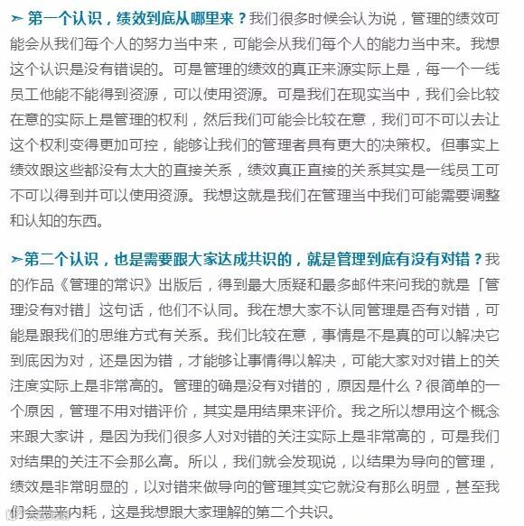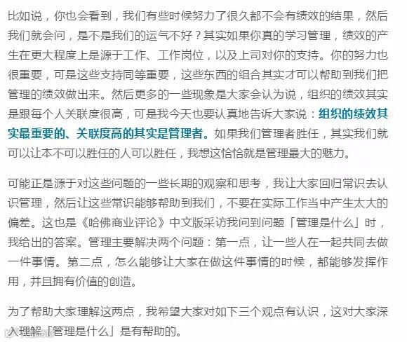 所以你会发现,员工的绩效其实是由管理者决定的,只要我们每个管理者能够真实的去理解管理的知识和常识本身,我们就会让我们所有身边的人产生绩效,而我们每个人因你而产生绩效的时候,组织的绩效和你本人的绩效也会取得进一步的成长。德鲁克给职业经理人一个非常好的定义,他说什么叫经理人?经理人他自己是没有绩效的,经理人的绩效取决于他的上司和他的下属,当他们都有绩效的时候,他就会有绩效。让一些人在一起共同去做一件事情,而且怎么能够让大家在做这件事情的时候,都能够发挥作用,并且拥有价值的创造。这就是管理。