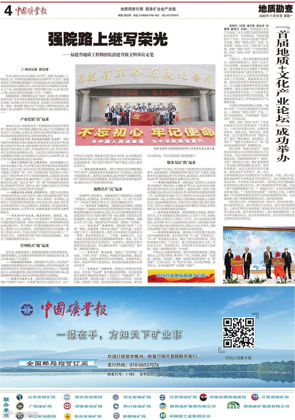 ——“宣传名片”远播扬名。该院借助各类载体,不断组织报道骨干力量每年在《中国自然资源报》《中国矿业报》《海峡资源报》媒体刊发稿件近百篇,先后采写《和着强院的节拍奋进》《探寻生态与发展“密码”》等一批大篇幅、大版面的宣传报道题材;精心打造“地勘先锋”微信公众号等载体,组建公众号工作小组,这些成为对外宣传的一道亮丽“风景线”。