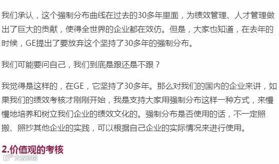 在工作目标和价值观的考核体系之下,关于强制分布曲线的运用与放弃,我们要去辩证的看,结合自己的企业的实际情况。