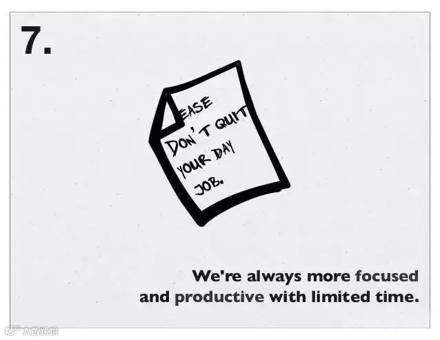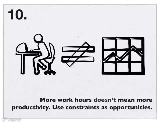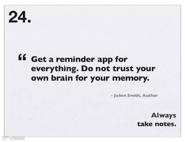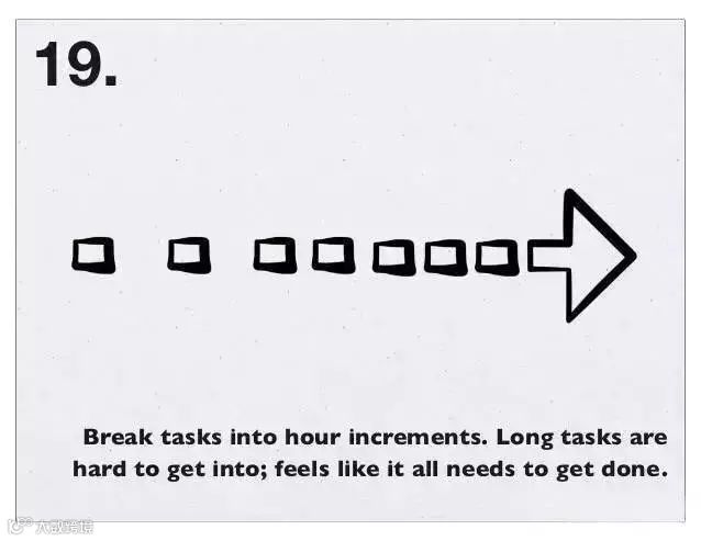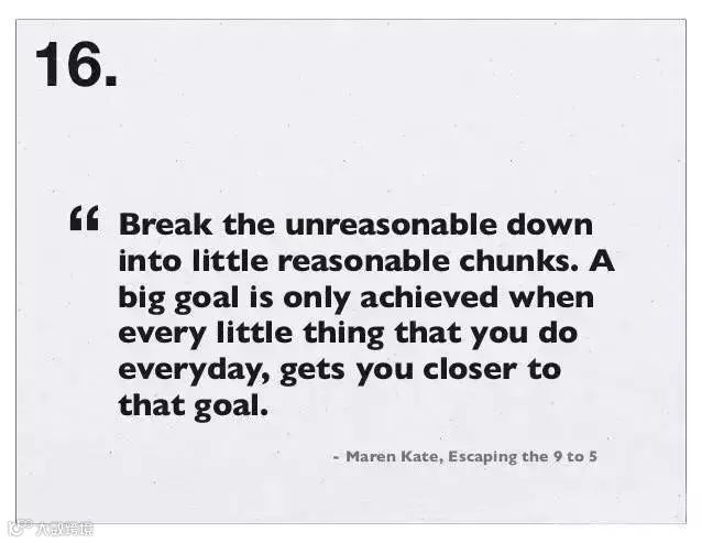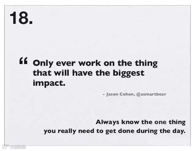 18、必须清楚白天必须完成的那件事是什么。“Only ever work on the thing that will have the biggest impact.” 只去做那件有着最大影响的事情。—— Jason Cohen