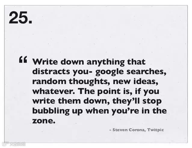 25、进入高效状态后,记下任何分散你注意力的东西比如Google搜索词、灵光乍现的想法、新点子等等。如果你把它们记下来,它就不会再蹦来蹦去了。