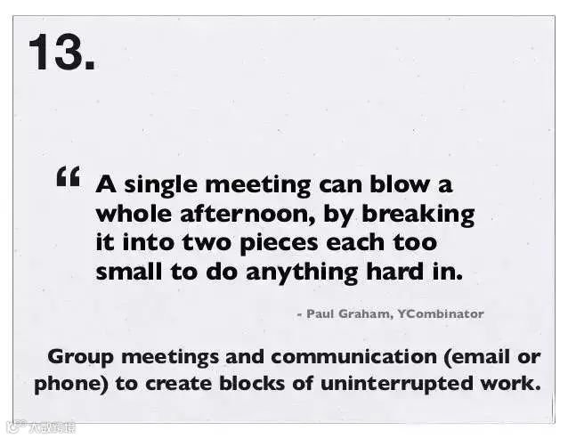13、把会议和沟通 (邮件或电话) 结合,创造不间断工作时间:一个小会,也会毁了一个下午,因为它会把下午撕成两个较小的时间段,以至于啥也干不成。