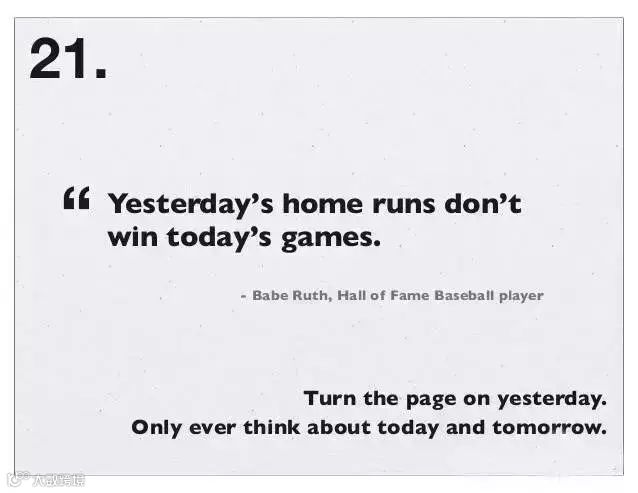 21、把昨天翻过去,只考虑今天和明天。昨天的全垒打赢不了今天的比赛。——好汉不提当年勇。