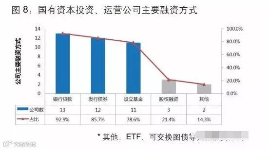 从融资方式来看,受访企业普遍采取了间接和直接融资相结合方式。超过90%受访企业选择银行贷款,有86%和79%受访企业探索通过发行债券和设立基金方式进行融资。选择股权融资方式的企业有云南国资运营公司、黑龙江大正投资集团和重庆渝富集团3家,占比20%,而选择ETF、可交换债等其他方式的企业不足15%。从现有的融资方式和比例看,尽管国有资本投资、运营公司作为与资本市场紧密对接的重要平台,但在创新融资手段方面仍然过多依赖债权融资,在股权融资方面还有待深化创新(见图8)。