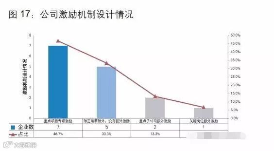 尽管现阶段尚未形成完全市场化的激励机制,但已有不少企业开始了这方面的探索。根据对受访企业的调查,超过六成的受访企业表示正在积极探索设计激励机制,有47%的企业选择采取重点项目专项激励,选择重点子公司额外激励和关键岗位额外激励的企业则分别占比13%和7%(见图17)。