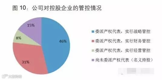 从对控股企业管控方式看,85%的企业均委派了产权代表,其中46%的企业选择了“委派代表+战略管控”,31%的企业选择了“委派代表+财务管控”(见图10)。
