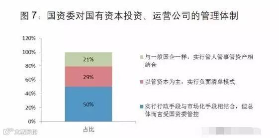 针对国有资本投资、运营公司,如何从功能定位出发完善国资监管,是本轮改革亟需完善的重要环节。从调查情况来看,仅有不足30%的企业表示,国资监管机构正在按照“管资本”为主的要求,探索实行负面清单管理模式。另有50%企业表示:目前国资监管机构实行行政手段与市场化手段相结合的管控方式,但总体而言受国资委管控;有21%企业表示,与一般国企一样,实行管人管事管资产相结合的方式。由此可见,各地国资监管部门在如何有效贯彻“管资本”为主的理念方面,认识上还不太一致,有待继续探索完善。