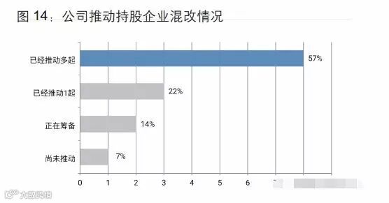 随着国企改革的深入推进,国有资本投资、运营公司推动持股企业发展混合所有制经济已初显成效。调查显示,90%以上企业均表示正在推进或准备推进持股企业混改,其中上海国际、湖北宏泰、河南国控等8家企业已推动多起混改(见图14)。