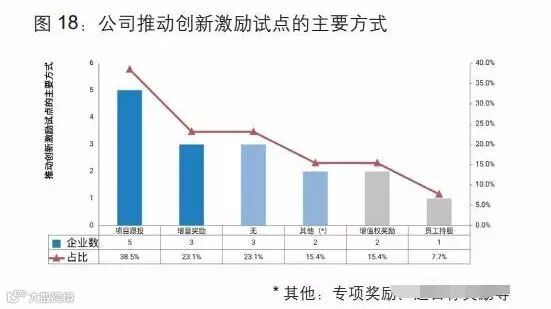 从推动创新激励试点的主要方式来看,近80%受访企业均在积极推动创新激励试点。受访企业中选择项目跟投作为激励试点方式的比重较高,占比39%;其次是增量奖励,占比23%;增值权奖励和员工持股则分别占15%和8%(见图18)。