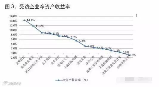 从收益水平看,不同地区由于市场化程度不同,资本运营能级不一,以及国有资本投资、运营公司的功能定位不同,各家企业资产收益状况差异比较明显。其中,拥有金融股权占比较高、市场化业务较多的企业,净资产收益率要明显高于以政策性、功能性业务为主的企业。如深圳投控以产权管理、资本运作及投融资业务为主,重庆渝富集团以股权类业务为主,收益率分别达到14.4%和11.9%。与此相对,内蒙古国资运营公司、云南国资运营公司等,以政策性和功能性业务为主,收益率分别为0.3%和-0.8%(见图3)。