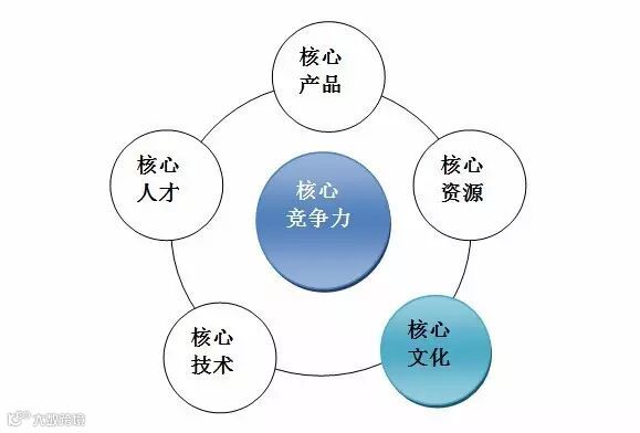 核心文化力不仅是企业的核心竞争力,它更是第一核心竞争力。从广义的角度来看,企业的核心竞争力包括:核心产品、核心人才、核心技术(知识)、核心文化、核心资源等在内的“五大”核心因素群(见图1),但从更深刻的角度来看,企业的核心竞争力则直指核心群的核心——核心文化。其根源在于: