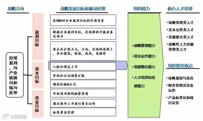 Y商业集团公司有十多家全资或控股子公司,近年来积极实施多元化发展战略。我们通过分析Y公司盈利目标、资本目标和资金目标等战略发展目标和驱动要素,从而识别企业战略对战略管理能力、资本运作能力、资源整合能力和人才培养和发展能力等组织能力的客观需求,也识别企业战略对战略管理类人才、资本运作类人才、资源整合类人才和战略性人力资源管理类人才的客观需求,明确了组织能力提升战略目标。如图所示: