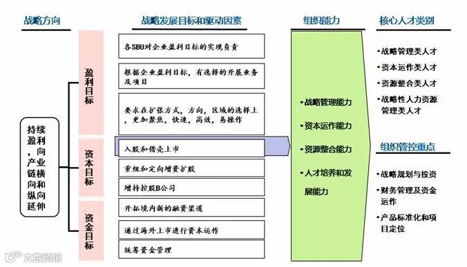 Y商业集团公司有十多家全资或控股子公司,近年来积极实施多元化发展战略。我们通过分析Y公司盈利目标、资本目标和资金目标等战略发展目标和驱动要素,从而识别企业战略对战略管理能力、资本运作能力、资源整合能力和人才培养和发展能力等组织能力的客观需求,也识别企业战略对战略管理类人才、资本运作类人才、资源整合类人才和战略性人力资源管理类人才的客观需求,明确了组织能力提升战略目标。如图所示: