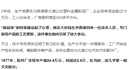 1980年,北滘公社配件厂的主要业务变更为为某国有电厂配套生产风扇配件,这次转变,给何享健的进一步做大提供了契机。