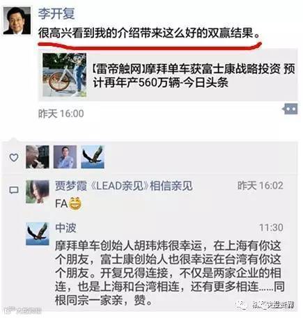 摩拜单车能够有富士康的战略投资和合作都是因为他从中牵线搭桥。